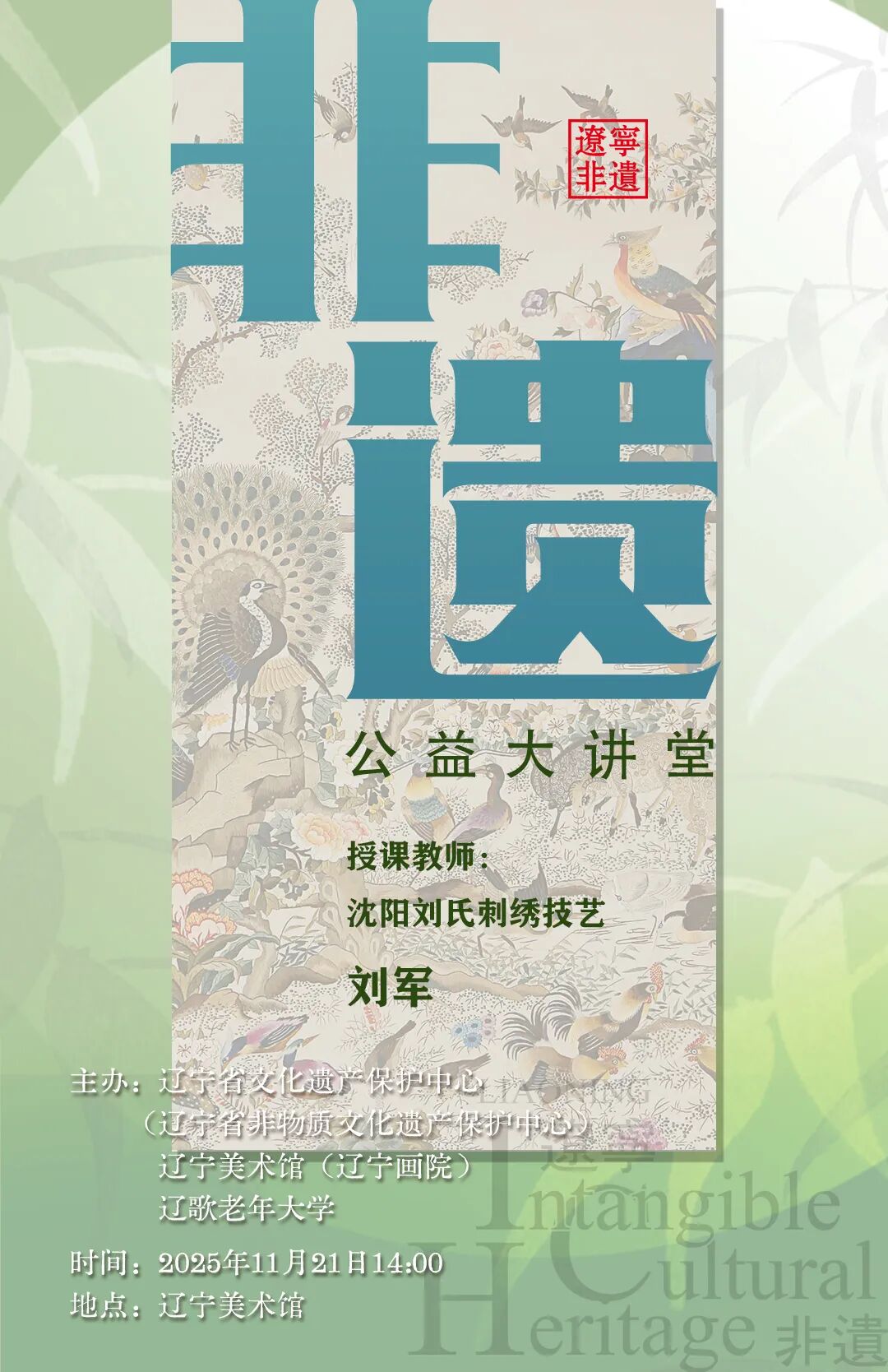 一针一线绣春秋,千年技艺续华章!11月21日14:00,辽宁省省级非物质文化遗产代表性项目——沈阳刘氏刺绣技艺将走进辽歌老年大学(辽宁美术馆校区),开展非遗公益大讲堂活动,带您领略传统刺绣的匠心魅力!