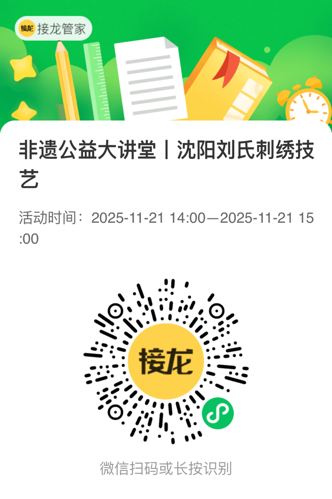 辽宁美术馆、辽歌老年大学长期致力于文化传播与教育,此次联合开展非遗进校园活动,旨在推动传统文化惠民共享,让非遗“活”在生活里。无论您是刺绣爱好者,还是传统文化追随者,均可免费参与,共赴这场指尖上的艺术之旅!